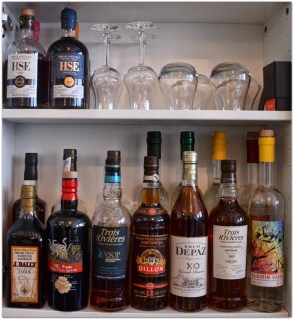 J’ai personnellement opté pour une solution proche de la première option. Dans mon armoire ancienne, j’ai les rhums de mélasse et dans le meuble plus moderne, les rhums de jus de canne.