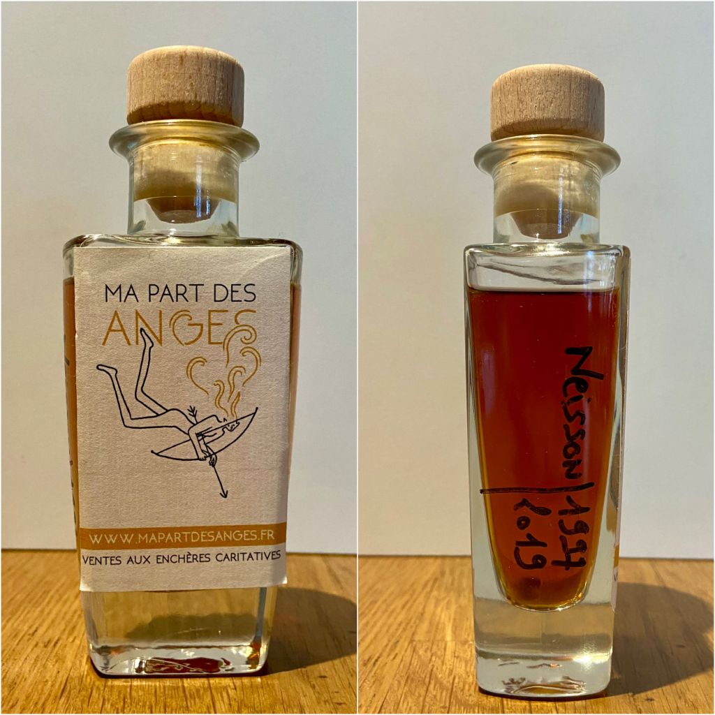 Le second Neisson que je m’apprête à déguster représente, d’une certaine manière, une rhum encore plus exceptionnel. Comment est-ce possible me direz-vous ? Eh bien, tout simplement du fait que ce rhum n’a pour l’instant jamais été mis en bouteille et possède un compte d’âge plus élevé que le titanesquement merveilleux 21 ans ! C’est grâce à une vente caritative organisée par l’association au but non lucratif Ma Part des Anges en avril 2020 et bien sûr à la distillerie du Carbet qui avait donné quelques centilitres pour ces enchères, que j’ai pu mettre la main – fébrile – sur ce flacon. Distillé en 1997 et mise en flacon en 2019, nous sommes face à une licorne parmi les licornes.